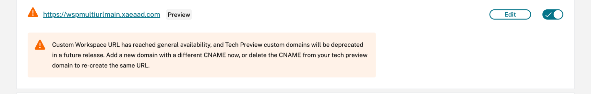 - Odstraňte URL náhledu vlastní domény V1 z Citrix Cloud.